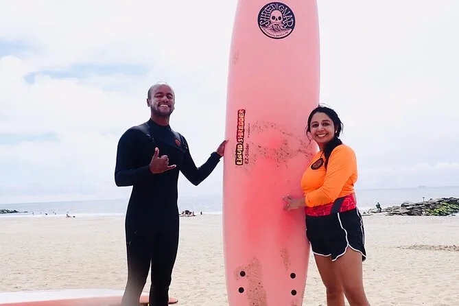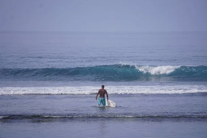 Wir starteten mit ein paar leichten Dehnübungen und etwas Yoga direkt am Strand. Mateo wechselte mühelos zwischen Englisch und Spanisch, damit jeder in unserer Gruppe folgen konnte. Er zeigte uns, wie man auf dem Brett „poppt“ – ehrlich gesagt sah das leichter aus, als es sich anfühlte! Wir übten ein paar Mal im Sand, während Möwen um einen übrig gebliebenen Bagel stritten. Danach gab es eine Sicherheitseinweisung im Wasser: Wo man paddelt, worauf man achten muss und wie man andere Surfer respektiert – er nannte es „Surf-Etikette“.