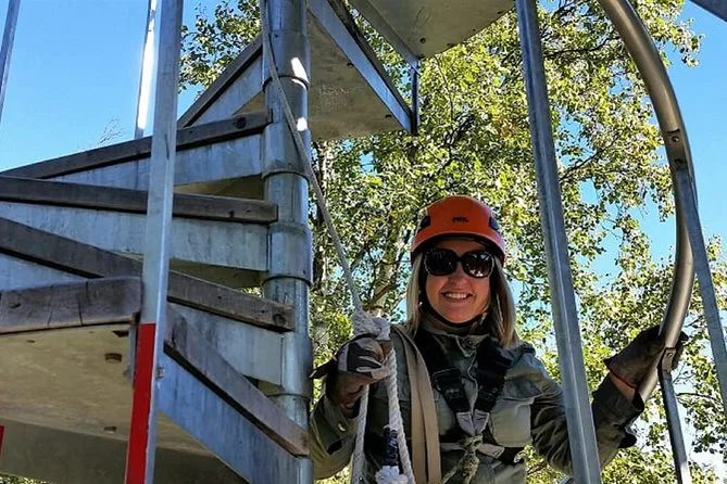 Du fährst 9 Ziplines, überquerst 2 Hängebrücken und steigst eine Wendeltreppe hinauf.
