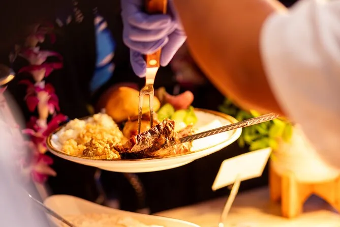 Die Essensausgabe ging flott: Kalua Pork, Poke, Prime Rib, wenn man wollte (ich habe zugeschlagen), und noch einige Gerichte, deren Namen ich nicht aussprechen konnte, aber die ich trotzdem probiert habe. Mit einem Mai Tai in der Hand (VIP-Gäste bekamen sogar zwei weitere Cocktails – Glückspilze), sahen wir zu, wie die Sonne hinter Diamond Head unterging, während die Künstler mit Liedern und Tänzen Geschichten von Hawaiis Königen erzählten. Das Feuer-Messertanz-Finale war einfach spektakulär – Funken flogen so nah, dass man den verbrannten Kokosnussschalen-Geruch in der Luft riechen konnte. Dieses Gefühl, Teil von etwas Altem und Lebendigem zu sein, bleibt mir bis heute, trotz all der Lichter der Hotels um uns herum.