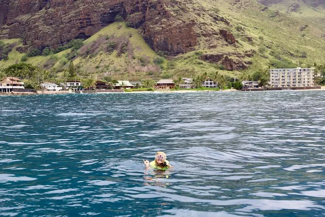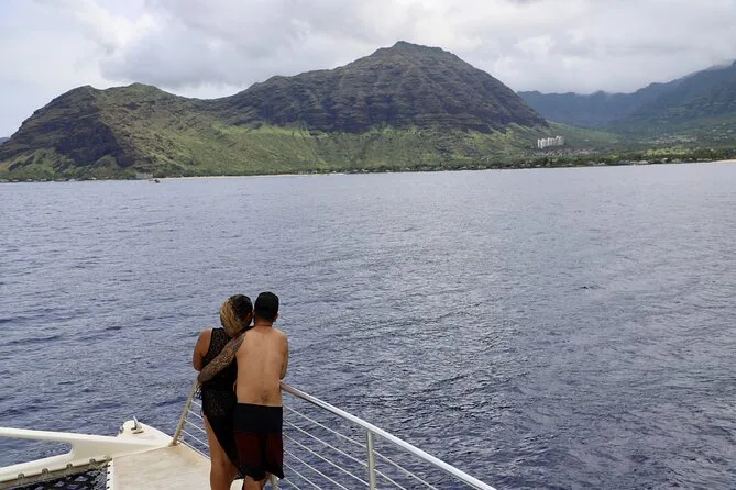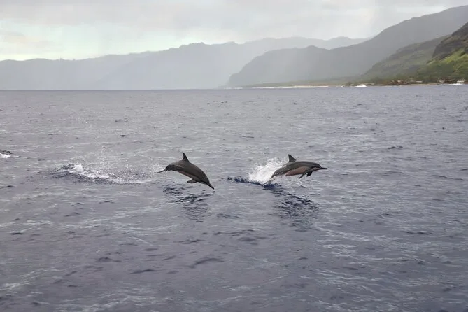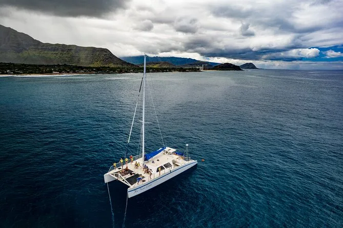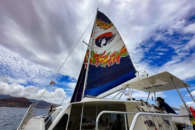 Segle entlang der Westküste Oahus, entdecke verspielte Delfine und schnorchle durch warme, türkisfarbene Riffe voller tropischer Fische und vielleicht sogar Schildkröten. Genieße ein Mittagessen an Bord – Puten-Pesto-Wrap oder vegetarische Variante – und stoße mit einem kühlen Getränk an, während die Bergkulisse vorbeizieht. Ein entspannter Ausflug mit freundlichen Guides, der dir noch lange ein Lächeln ins Gesicht zaubert.