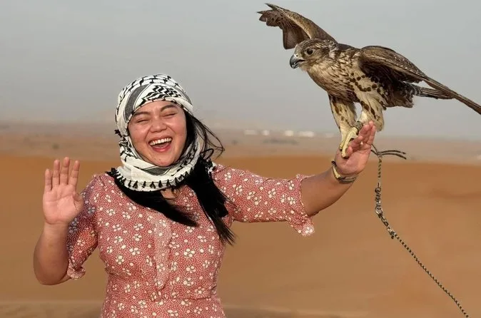 Dein Abend beinhaltet klimatisierten 4WD-Hoteltransfer in Dubai, etwa 30 Minuten Dune Bashing durch goldene Dünen, eine kurze Kamelritt-Erfahrung, arabischen Kaffee (Gahwa) mit Datteln sowie lokale Snacks wie Falafel und Luqaymat im Camp, unbegrenzt Wasser und Softdrinks, ein internationales BBQ-Buffet mit vegetarischen Optionen, Sandboarding, Live-Shows mit Tanura-Tanz und Feuershow (Bauchtanz außer Ramadan), Henna-Malerei für Damen (kleines Design) und optional eine Falken-Fotoerfahrung gegen Aufpreis, bevor es zurück zum Hotel geht.