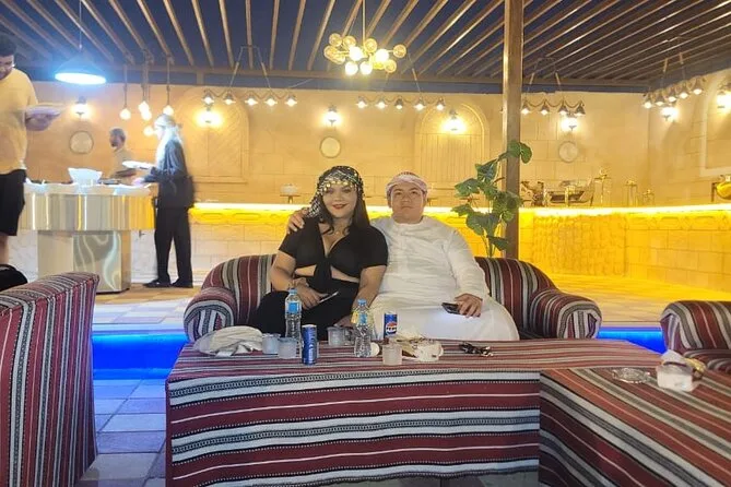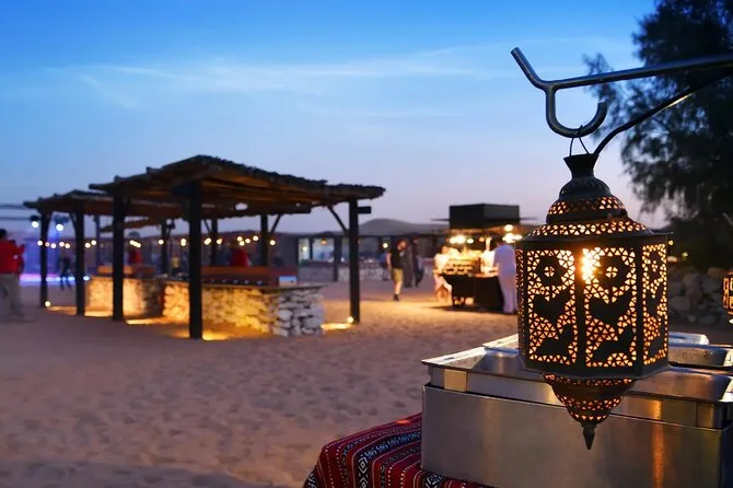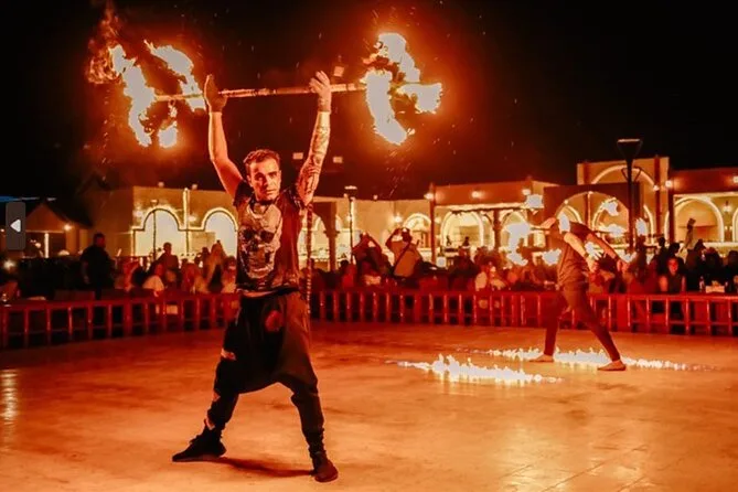 Du erlebst eine kurze Kamelritt-Tour, kannst Sandboarden, siehst Live-Shows (Feuershow, Bauchtanz), bekommst Henna-Tattoos, hast Zugang zur Shisha-Lounge und ein BBQ-Dinner.
