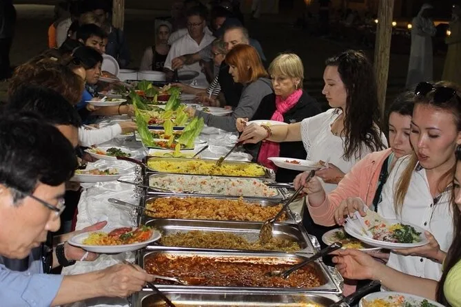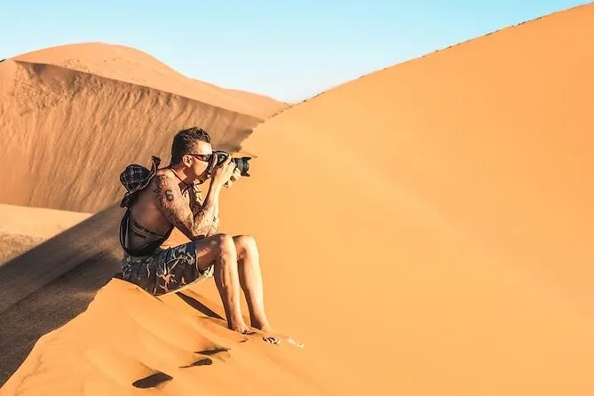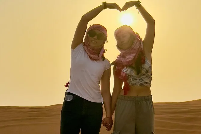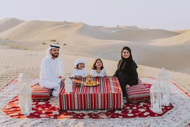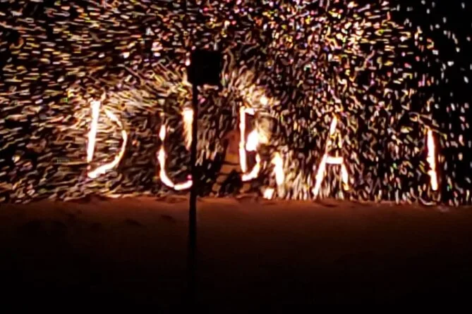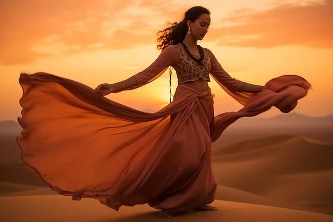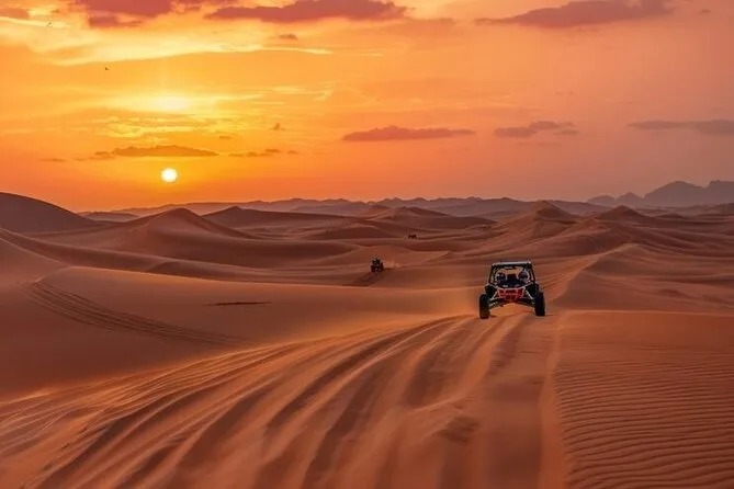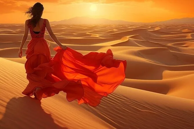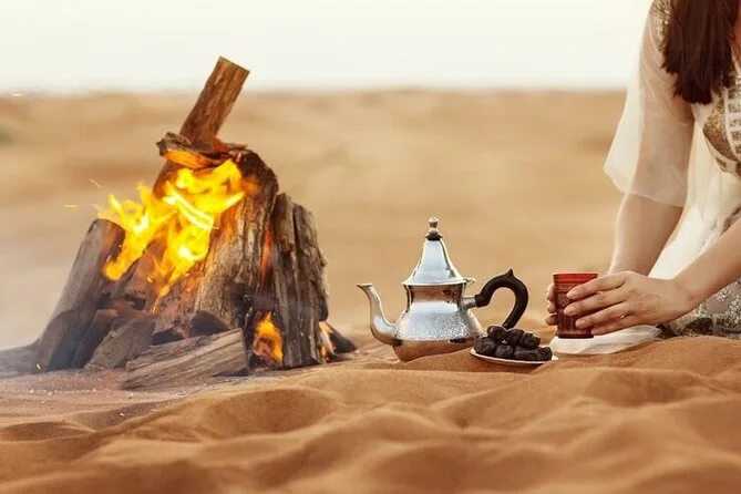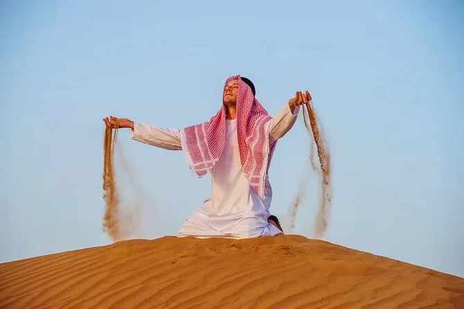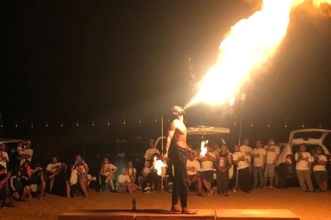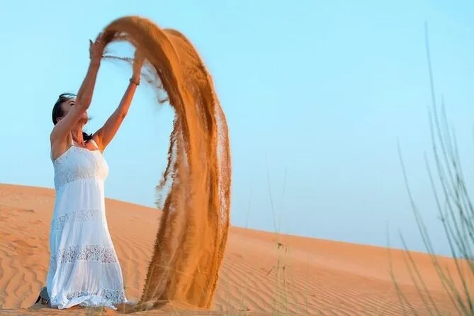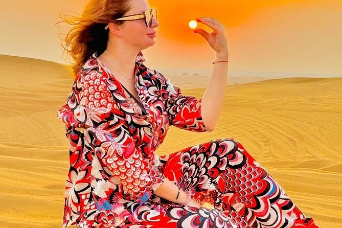 Die Tour umfasst Dune Bashing, Kamelritt, Sandboarding, Fotostopp bei Sonnenuntergang, Live-Shows (Tanura-Tanz, Bauchtanz & Feuershow), Henna-Malerei für Damen, arabischen Kaffee & BBQ-Buffet.