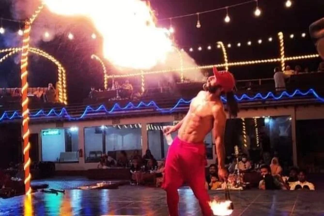 Im Wüstencamp war es ruhiger als gedacht – nur Wind und gedämpfte Stimmen. Einer der Mitarbeiter reichte mir arabischen Kaffee in einem winzigen Becher (bitter, aber lecker) und Datteln, die an den Fingern klebten. Kamele lagen faul herum und sahen gelangweilt aus; als ich dann selbst auf eins steigen durfte, verlor ich fast einen Schuh beim Aufsteigen. Wer wollte, konnte sich Henna malen lassen (das Design meiner Freundin sah eindeutig cooler aus als meins). Später saßen wir alle auf Kissen, während Tänzer unter bunten Lichtern wirbelten – der Tanura-Tänzer drehte sich so lange, dass mir vom Zuschauen schwindelig wurde. Die Feuershow war ebenfalls beeindruckend; die Hitze spürte man selbst aus der Entfernung.