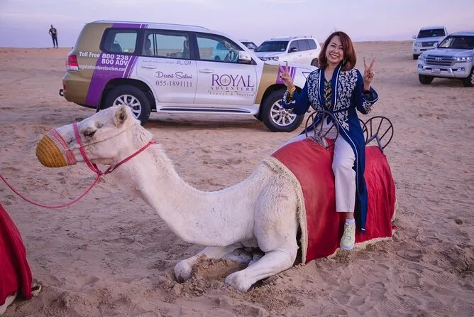 Die Tour umfasst Dune Bashing, Quad fahren, Kamelreiten, Sandboarding, Henna-Malerei, Live-Shows (Bauchtanz & Tanoura) und ein BBQ-Abendessen.