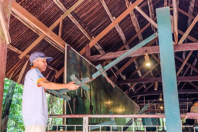 Erster Halt war eine Lackwaren-Werkstatt – ehrlich gesagt dachte ich, das wird nur so ein Touri-Stopp, aber die Künstler, die winzige Muscheln in den schwarzen Lack einarbeiteten, waren faszinierend anzusehen. Es roch leicht nach Lack und etwas Süßem in der Luft. Nach einer schnellen Pause (Gott sei Dank) fuhren wir weiter durch Reisfelder, bis die Umgebung plötzlich ruhiger und grüner wurde. Bei den Cu Chi Tunneln angekommen, gab uns Linh Wasserflaschen und führte uns unter hohe Bäume, wo die Zikaden laut zirpten. Sie warnte uns vor dem Propagandavideo – „Das ist noch aus der alten Zeit“, sagte sie grinsend – und ja, es war schon ein bisschen surreal, die Schwarz-Weiß-Aufnahmen zu sehen, während mir der Schweiß den Rücken runterlief.