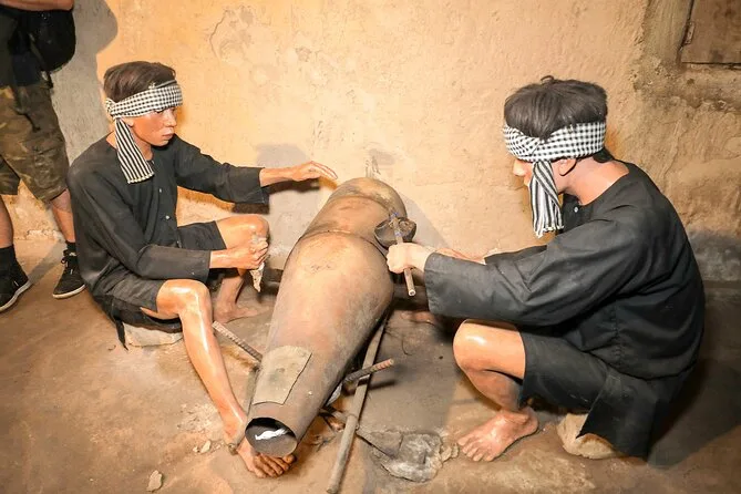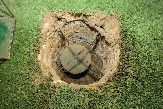 Ich hätte nie gedacht, dass ich wirklich durch so einen Tunnel kriechen würde. Aber Linh ermutigte jeden, der neugierig war, mindestens die 20 Meter lange Strecke auszuprobieren („Keine Sorge! Es gibt Ausgänge!“). Der Tunnel war kühl, aber eng; man spürte die raue Wand unter den Händen. Als ich am anderen Ende wieder rauskam, klebte mein Shirt an der Haut und alle sahen erleichtert (und ein bisschen staubig) aus. Einige versuchten sich am Schießstand mit einer AK47 – nicht so mein Ding, aber das scharfe Knallen hallte immer wieder durch die Bäume.