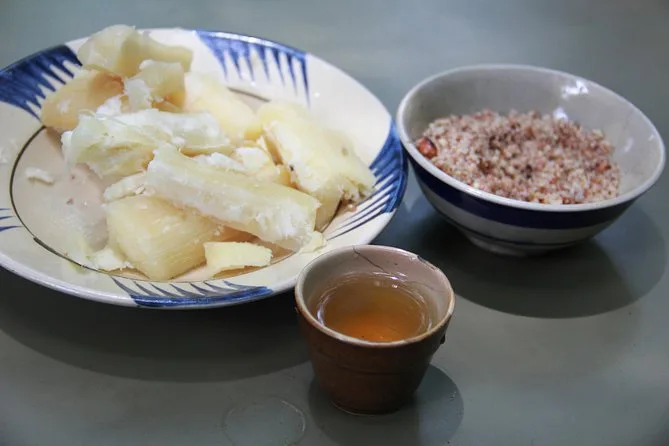 Du bekommst Wasser sowie gekochte Tapioka und Tee bei den Cu Chi Tunneln als Teil der Tour.