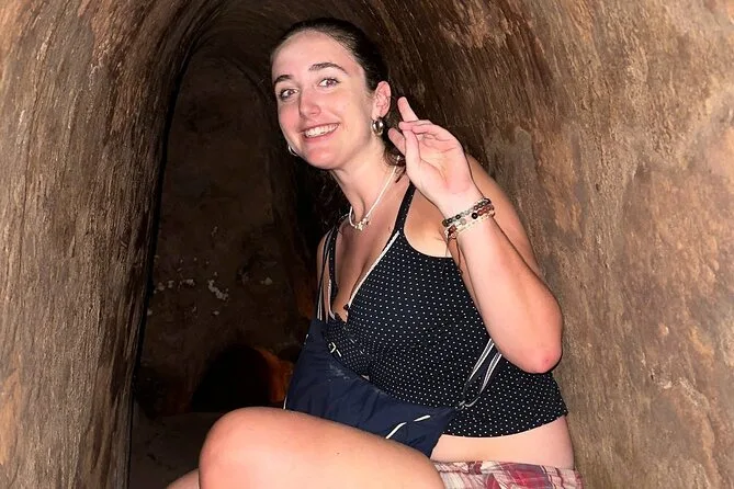 Beim Spaziergang durch den Wald zeigte Minh kleine Falltürchen, halb von Blättern verdeckt. Er grinste und forderte uns heraus, in einen zu kriechen – ich habe es versucht (nicht gerade elegant), und alle lachten, als mein Rucksack stecken blieb. Die Tunnel waren kleiner als gedacht; das Kriechen fühlte sich eng und gedämpft an, fast wie unter Wasser, aber wärmer. Kaum vorstellbar, dass Menschen dort jahrelang lebten. Ab und zu hielten wir an unterirdischen Räumen – Kommandoposten oder Küchen – und Minh erklärte, wie sie ohne Rauch zu erzeugen kochten. Bei einer Küche von Hoang Cam roch man ganz leicht Holzkohle, wenn man sich vorbeugte.
