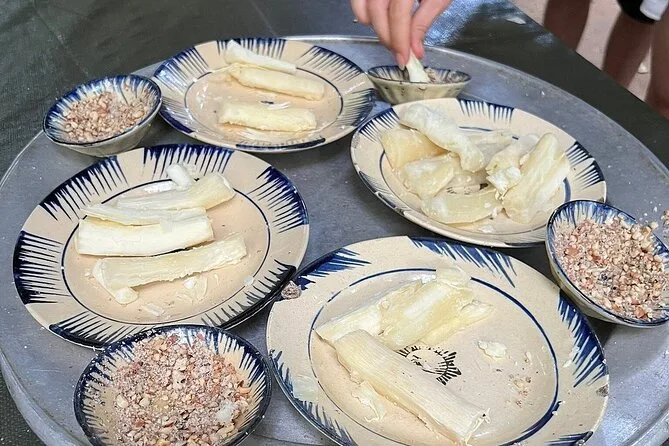 Du bekommst gekochten Maniok (Tapioka) mit vietnamesischem heißem Tee angeboten.