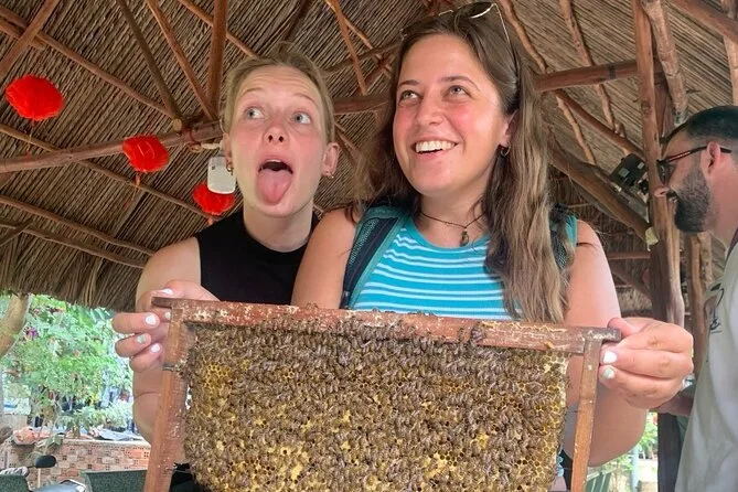 Danach stiegen wir wieder in den Van für die zweistündige Fahrt ins Mekong-Delta. Hier war es wärmer, und irgendwo lag der süße Duft von Früchten in der Luft. Wir stiegen in ein langes Holzboot, das uns den Fluss entlang zur Einhorninsel brachte. Überall Palmen, deren Blätter uns beim Umsteigen in kleine Sampan-Boote streiften – eine ruhigere Etappe. Das Wasser war braun, aber ruhig. Lokale Musiker spielten Volkslieder, während wir Ananas- und Drachenfruchtstücke probierten (meine fiel mir prompt auf den Schoß, aber das störte niemanden). An einer Station zeigte uns eine Familie ihre Bienenstöcke; ich bekam klebrige Finger, als ich frischen Honig direkt aus der Wabe kostete.