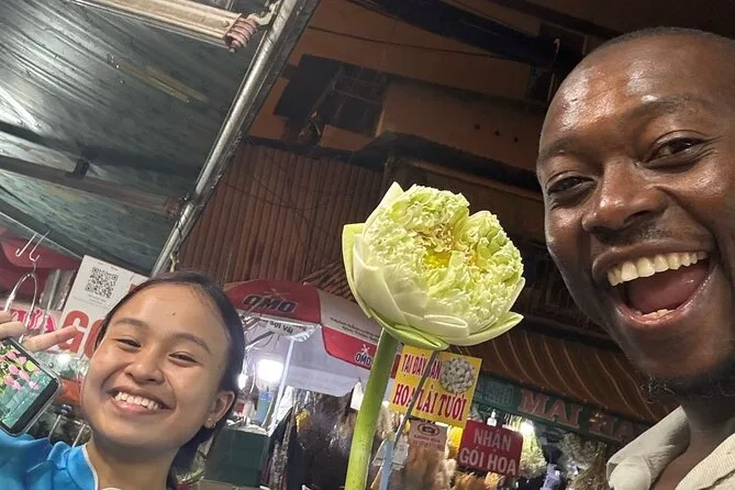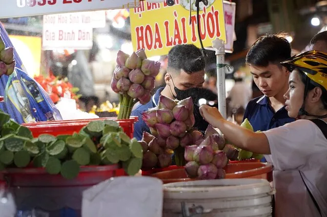 Zwischen dem Schlürfen von Nudeln und dem Probieren von gegrillten Schnecken (ich zögerte, aber Linh bestand darauf) fuhren wir am Hồ Thị Kỷ Blumenmarkt vorbei. Selbst nachts leuchteten die Farben unter den Straßenlaternen – Rosa, Gelb, alles verschwommen, während wir vorbeirauschten. Die Luft roch dort anders; süßer, fast feucht von zerdrückten Blütenblättern unter den Füßen. Ich dachte mir: So fühlt sich eine echte Saigon-Food-Tour an – chaotisch, laut und voller kleiner Überraschungen.
