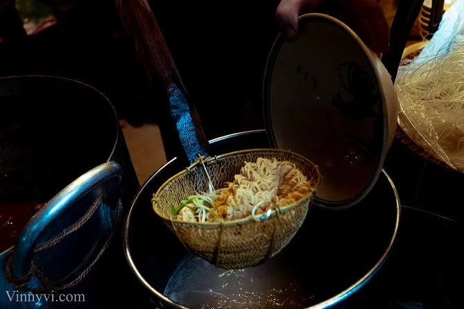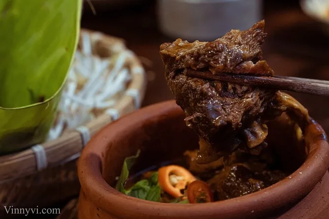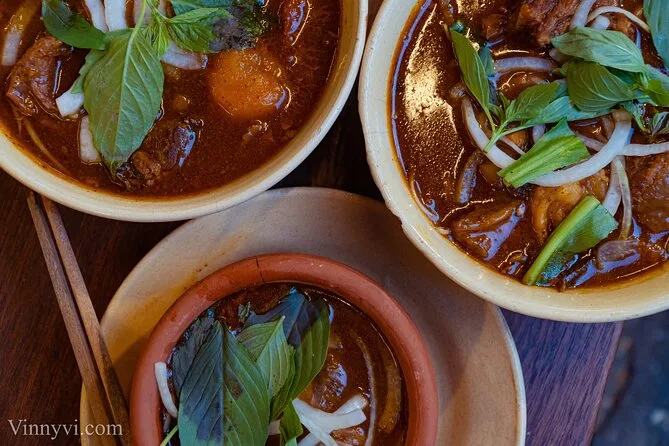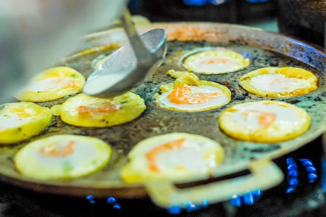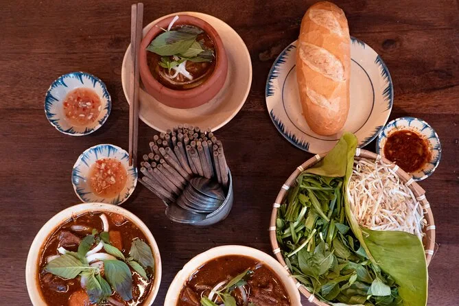 Du probierst rund neun Gerichte, darunter Reismehl-Pfannkuchen (bánh xèo & bánh khọt), Rindereintopf (bò kho), Bananenpfannkuchen oder vietnamesische Pizza, Kokoseis oder Gelee, Meeresfrüchte oder BBQ (bei Allergien), Flan-Dessert mit Karamell & Kaffee sowie hausgemachten Klebreiswein.
