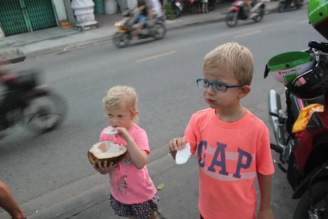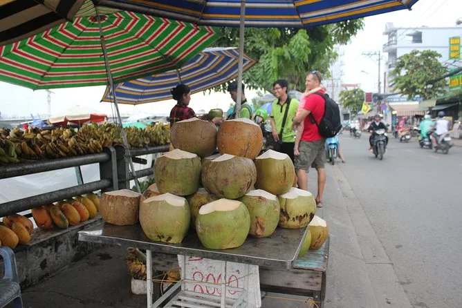 District 4 war schon voller Leben. Straßenverkäufer bauten ihre Stände auf und riefen sich in schnellen vietnamesischen Wortfetzen zu, die ich zwar nicht verstand, aber irgendwie spürte. Minh zeigte auf eine Frau, die Körbe mit Obst auf der Schulter balancierte – er erzählte, sie arbeite hier schon seit Jahrzehnten. Der Duft frischer Kräuter schlug mir entgegen, als wir vorbeifuhren; Minze und etwas Scharfes, das ich nicht benennen konnte. Dann kamen wir nach District 7, wo Boote dicht an dicht am schwimmenden Markt lagen. Menschen reichten sich Ananas, Säcke mit Eis und andere Waren von Hand zu – und ein Mann grinste uns an, als wären wir alte Freunde, nur weil wir da waren. Das fühlte sich echt an.