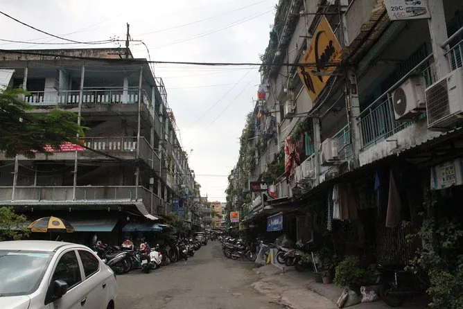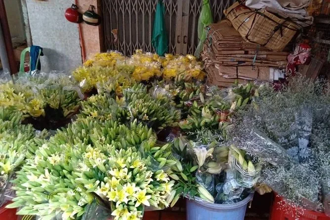 Wir fuhren über eine Brücke zwischen District 5 und einer Insel – ich glaube, Minh nannte sie Bình Đông? – und plötzlich änderte sich alles: Hinter uns spiegelten sich gläserne Neubauten, vor uns lehnten sich ältere Häuser eng aneinander. Es war ein krasser Kontrast, aber auf seltsame Weise wunderschön. Als Nächstes kam der Blumenmarkt; Eimer voller Ringelblumen und Lilien, Blütenblätter klebten an meinen Schuhen, als ich vom Moped stieg (ich finde immer noch eine Blüte in meinem Rucksack). Die Luft war schwer von Parfüm und Abgasen.