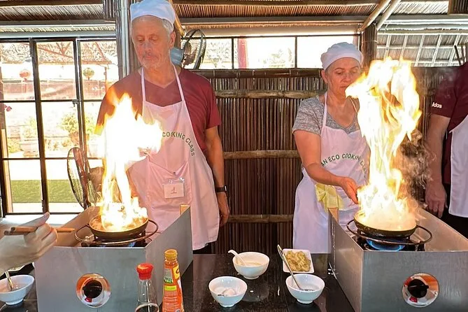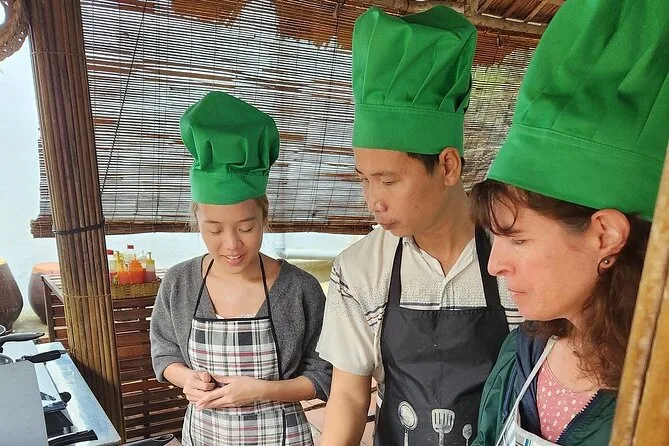Dein Tag startet mit Abholung vom Hotel in zentralem Hoi An oder Treffpunkt, einem englischsprachigen Guide, allen Zutaten für den praktischen vegetarischen Kochkurs (inkl. Rezeptbuch), einem geführten Spaziergang über den Markt, einer Bambus-Korbbootfahrt durch Kokospalmen (mit optionalem Krabbenfangen), sowie Mittag- oder Abendessen mit deinen selbstgekochten Gerichten – entspannt und satt geht’s dann zurück.