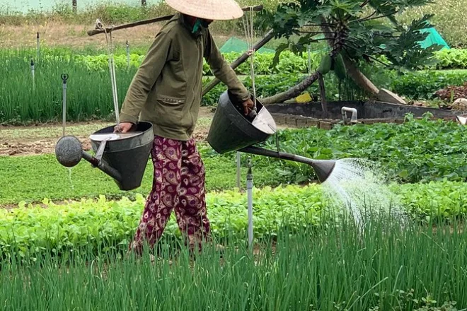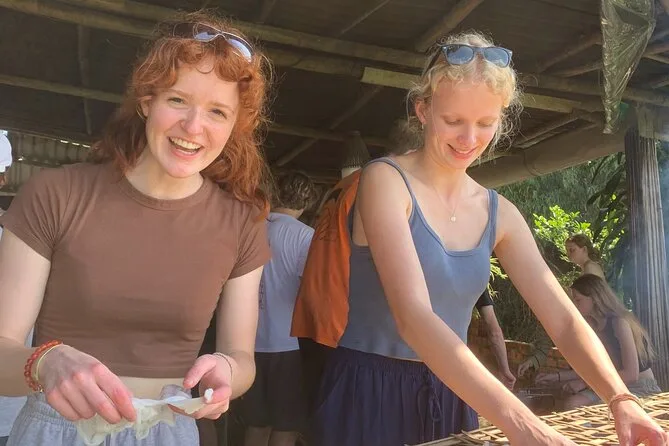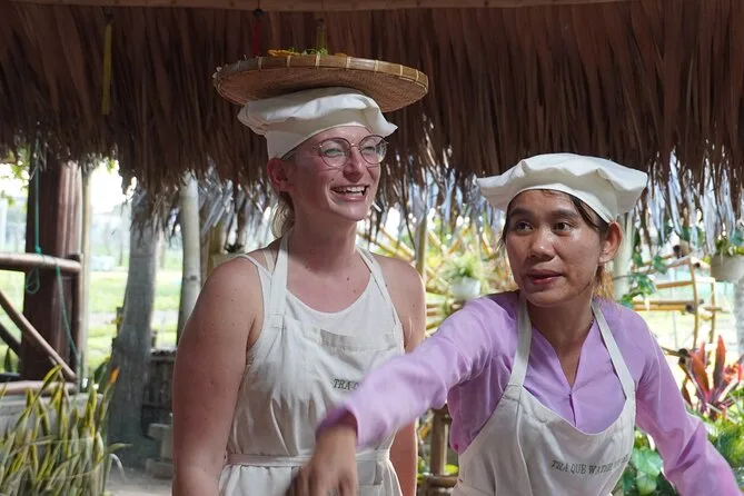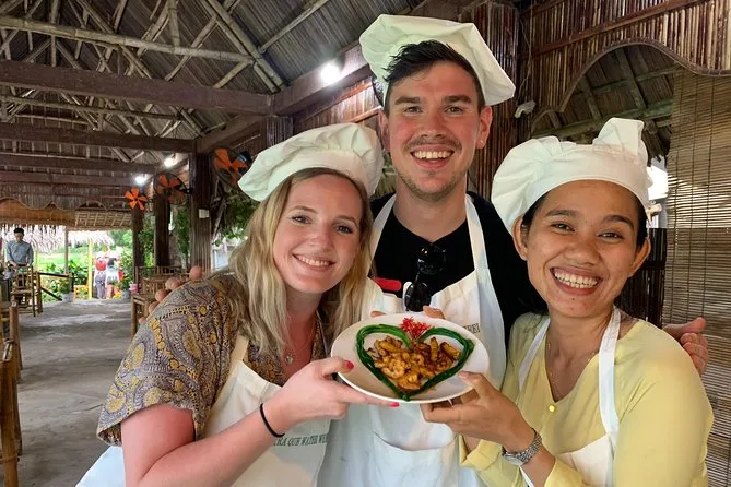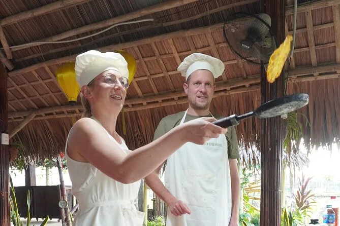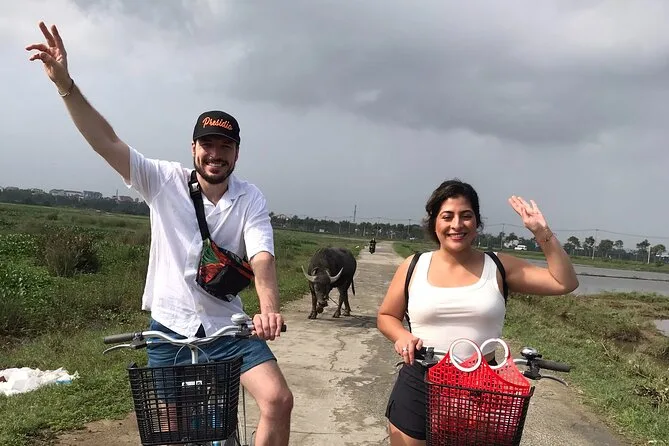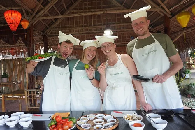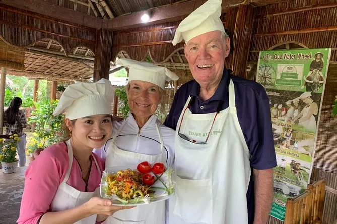 Dein Tag umfasst privaten Transfer für bequeme Abholung und Rückfahrt, alle Aktivitäten wie Radfahren durch Reisfelder, gemeinsames Arbeiten mit Bauern, Wasserbüffelreiten und Korbbootfahren. Außerdem ein praktischer Kochkurs mit traditionellen vietnamesischen Gerichten und ein Mittagessen im Tra Que Water Wheel Restaurant, bevor du entspannt zurückkehrst (und wahrscheinlich satt).
