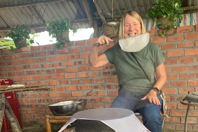 Der Kochkurs fand in einem alten Holzhaus statt, offen zum Garten, sodass man die Hühner gackern hörte, während wir Reispapier von Grund auf selbst machten. Meine Frühlingsrollen sahen schief aus, schmeckten aber fantastisch – salziger Fisch im Tontopf, knusprige Pfannkuchen und frischer Salat. Das gemeinsame Mittagessen fühlte sich an wie ein Treffen mit Freunden nach harter Arbeit auf dem Feld. Ich denke immer noch an den Blick über die Kräuter, als wir endlich Platz nahmen.