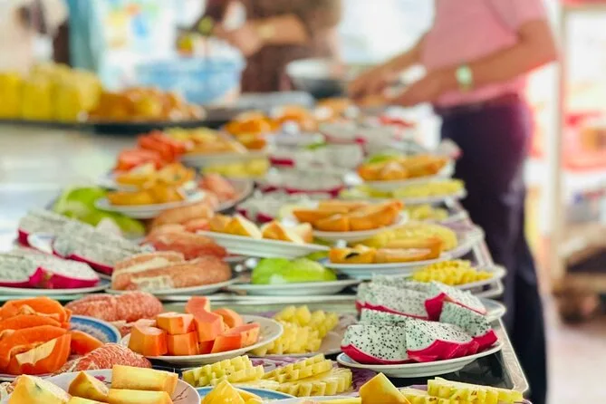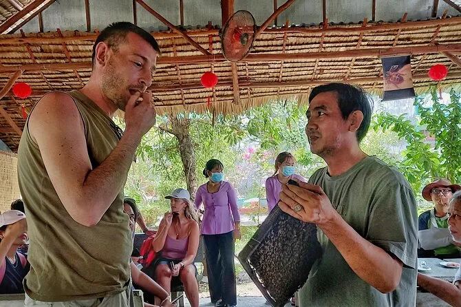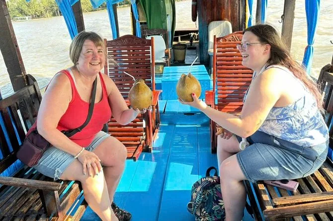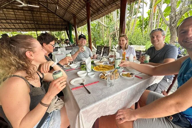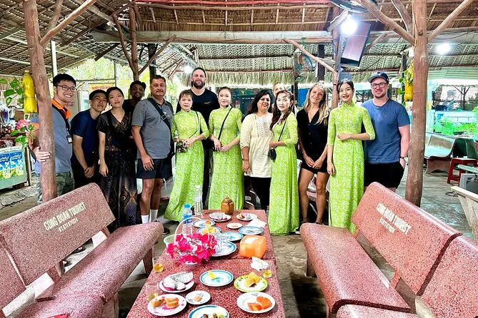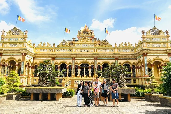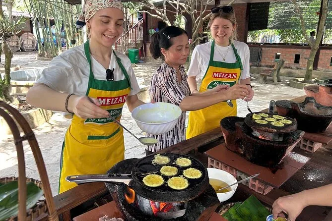 Dein Tag beinhaltet Abholung vom Hotel oder Treffpunkt im District 1, Eintritt zu allen Sehenswürdigkeiten wie der Vinh Trang Pagode, eine Bootsfahrt auf dem Mekong mit Stopps auf der Einhorn-Insel, einen praktischen Bánh Khọt Kochkurs mit lokalen Experten, Fruchtverkostung mit Honigtee, Wasserflaschen während der gesamten Tour, eine Fahrt mit dem motorisierten Rikscha (xe-lam), ganztägige Betreuung durch einen professionellen englischsprachigen Guide sowie ein traditionelles vietnamesisches Mittagessen (vegane Optionen verfügbar), bevor es am späten Nachmittag zurück nach Saigon geht.
