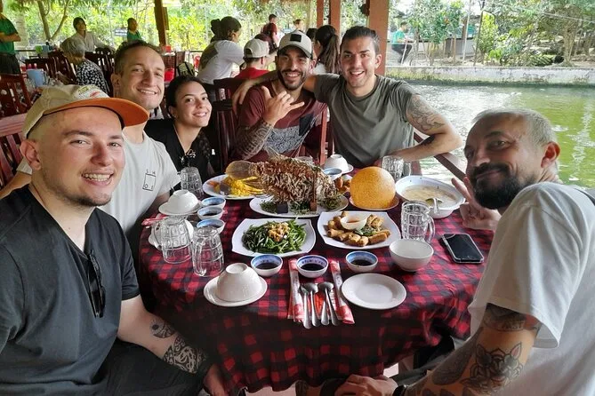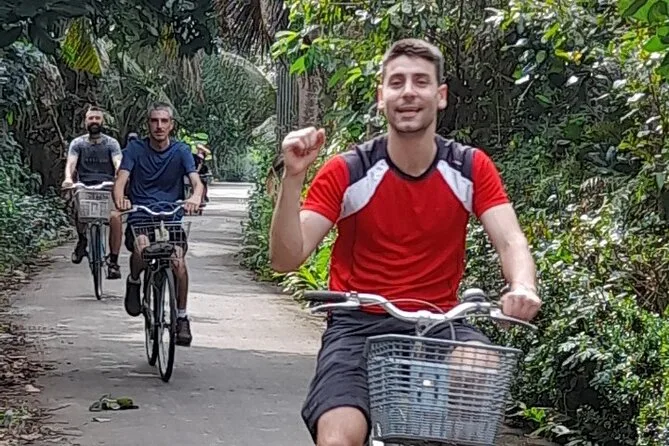 Du stehst früh in Can Tho auf, frühstückst und gleitest dann mit einem lokalen Guide durch das bunte Treiben des Cai Rang Schwimmenden Markts. Probier tropische Früchte direkt von den Booten, sieh zu, wie Reisnudeln hergestellt werden, und radle anschließend durch ruhige Dörfer unter Kokospalmen. Das Mittagessen ist einfach, aber voller Geschmack – und du nimmst mehr mit als nur Fotos.