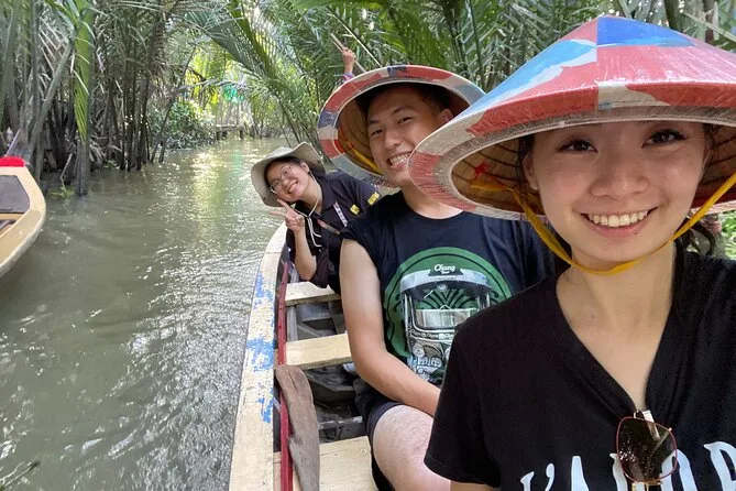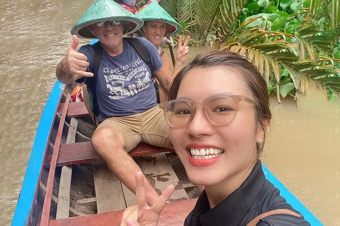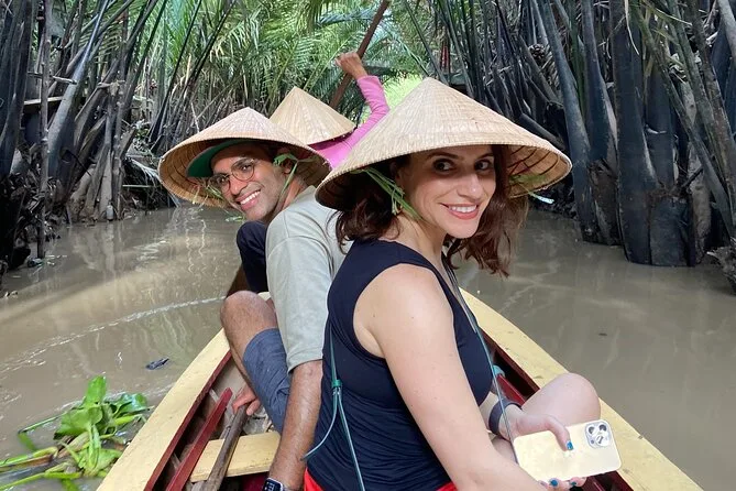 Ben Tre hatte eine ganz andere, ruhigere Atmosphäre. Die Kokosbonbon-Manufaktur roch nach karamellisiertem Zucker und Holzrauch. Ich durfte selbst mal rühren (nicht sehr geschickt), und Li lachte herzlich, als ich versuchte, „kẹo dừa“ auf Vietnamesisch auszusprechen – ich hab’s wohl ziemlich verhauen. Später glitten wir mit einem kleinen Ruderboot durch einen schmalen Kanal; die Wasserpalmen bogen sich so nah über uns, dass sie fast meinen Hut streiften. Es war feucht und friedlich, nur die Zikaden machten irgendwo oben ordentlich Krach. Danach ging’s mit einem Elektroauto gemütlich durch verschlafene Gassen zurück zum Bus. Dieses Licht auf dem Fluss am späten Nachmittag – golden und weich – das bleibt mir noch lange im Kopf.