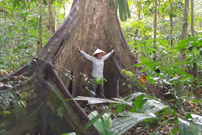 Das Mittagessen war einfach – Tofu, frisches Gemüse, Reis – doch irgendwie schmeckte alles draußen in der Natur viel intensiver. Vielleicht lag es am satten Grün ringsum. Nach dem Essen führte uns Minh in den Wald zu unserer Dschungelwanderung. Unter den mächtigen Bäumen lag eine feuchte, süßliche Luft, die ich nicht genau einordnen konnte. Wir machten Halt bei einem riesigen, tausendjährigen Baum (Cay Cho Xanh), dessen Wurzeln sich wie aus einem Märchen verzweigten. Minh erzählte eine Legende dazu, doch ich war abgelenkt von einem Schmetterling, der auf meinem Ärmel landete. Manchmal hörte man nur Vogelgesang oder das Rascheln der Blätter unter den Füßen – eine ganz besondere Ruhe.
