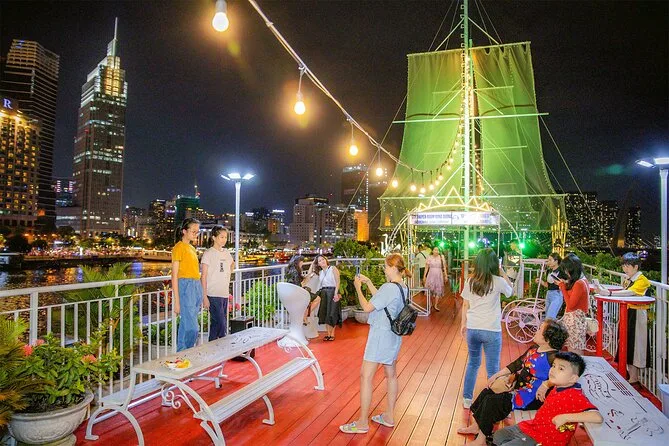 Saigon bei Nacht: Musik, Essen und Lichter spiegeln sich im Fluss