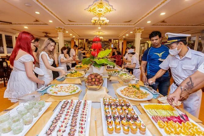 Ich hatte mich fürs Buffet entschieden (konnte mich einfach nicht festlegen), aber es gab auch Menüs zur Auswahl. Minh hatte uns vorher daran erinnert, die Wahl zu treffen – an Bord kann man nichts mehr ändern. Das Personal bewegte sich leise, brachte Gerichte mit Düften von Zitronengras und gegrilltem Fisch. Ich versuchte, „cảm ơn“ zu sagen; sie lächelte höflich, wahrscheinlich hab ich’s falsch ausgesprochen. Die Luft war warm, aber nicht schwül, und ab und zu wehte eine Brise mit Aromen von Flussboden und etwas Blumigem vom Oberlauf herüber.