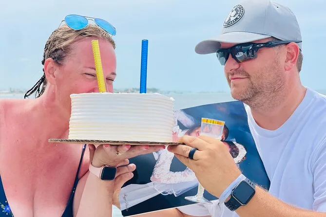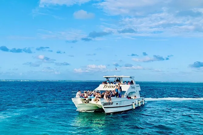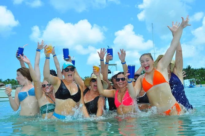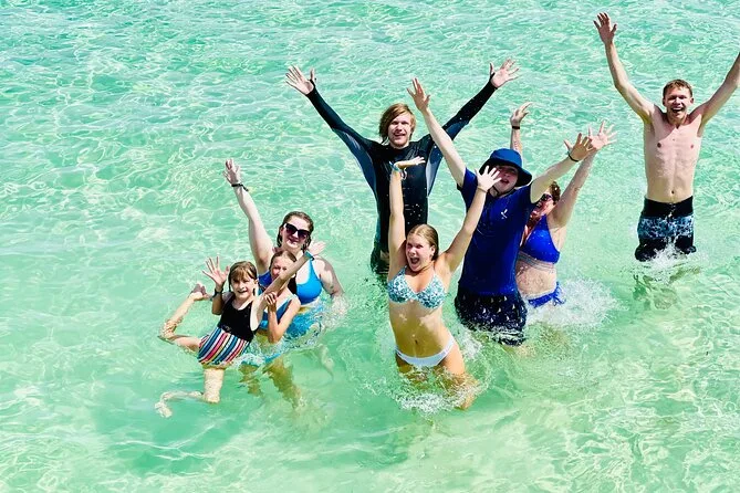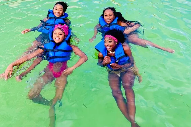 The tour includes snorkeling stops, dolphin spotting from the boat, swimming in a natural pool, music onboard, and use of a slide.