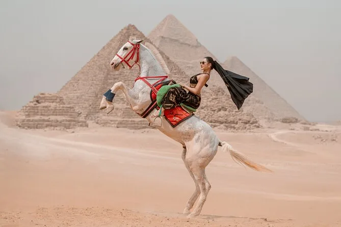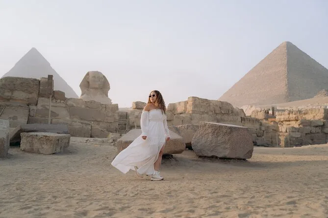 Your day includes a guided photo walk across Giza’s plateau with stops at panoramic pyramid viewpoints and close-ups near the Sphinx and Great Pyramid; you’ll receive up to 15 professionally edited photos delivered digitally after your session—no photography experience or personal camera required.