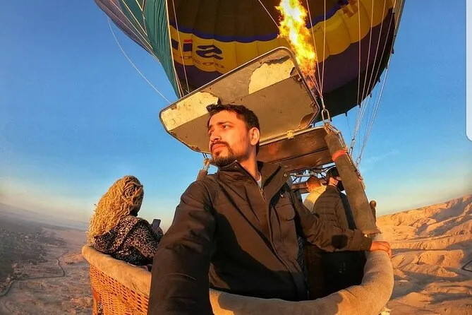 Your day includes hotel pickup before sunrise, a motorboat crossing of the Nile with tea and cake for breakfast, guided hot air balloon flight over Luxor lasting around 45 minutes to an hour (weather depending), plus a folkloric show and medal presentation with your local crew before drop-off back at your hotel.