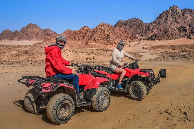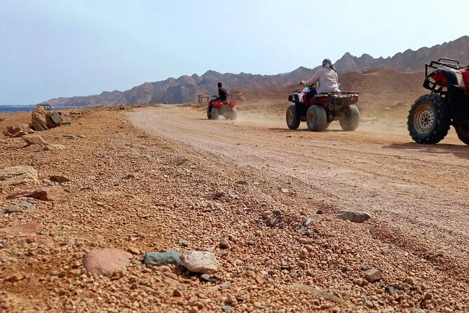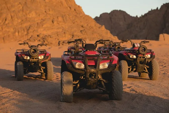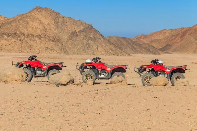 Your day includes pickup and drop-off from your hotel in Sharm El Sheikh by air-conditioned vehicle, about 50 minutes of quad biking with all safety gear provided, a visit to Echo Mountain’s natural acoustics, time at a traditional Bedouin village with herbal tea served by locals, and if selected when booking, a peaceful camel ride through the Sinai sands before heading back.