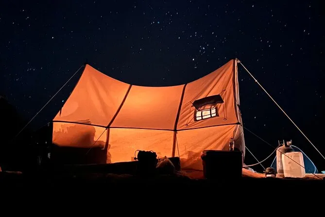 Your overnight adventure includes lunch, dinner around a campfire under desert stars, breakfast after sunrise by the dunes, guidance from local Bedouin hosts who know every corner of these sands—and time to soak in a natural hot spring before heading back toward town.