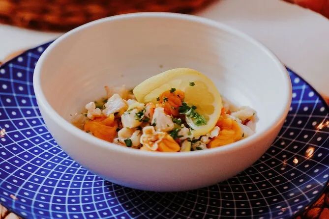 El menú incluye ceviche, ensalada de camarones criolla, plato principal Land & Sea y quesillo de coco de postre.