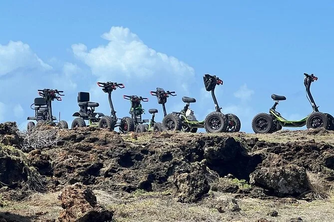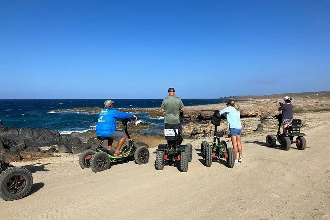 Recorre en un EZ Raider eléctrico la costa norte salvaje de Aruba con un guía local, explorando ruinas de oro y formaciones rocosas antes de nadar en la tranquila Pearl Cove. Disfruta un pastechi fresco en una parada y conoce burros rescatados en el camino. Prepárate para el viento en el pelo y anécdotas para contar.