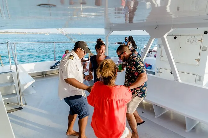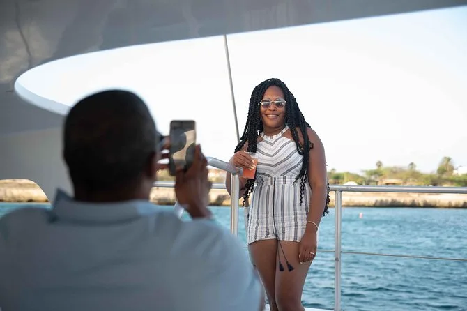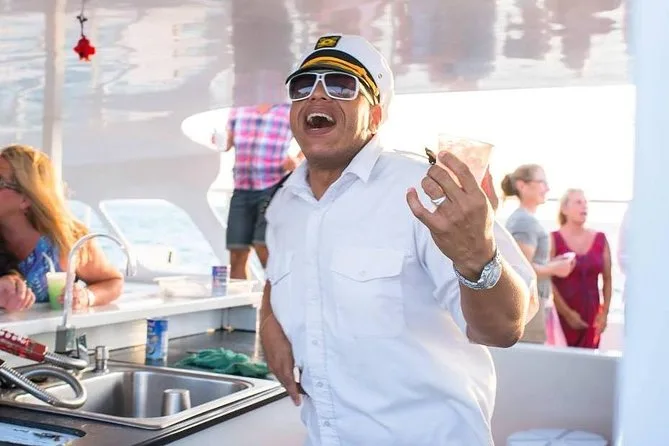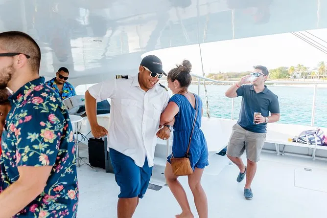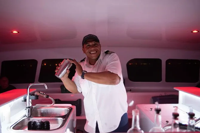 Tu velada incluye navegar en un catamarán de lujo desde Palm Beach hacia el faro de Aruba, con mucho espacio para relajarte o bailar, aperitivos frescos servidos a bordo, barra libre con cerveza local y cócteles durante todo el trayecto, además de música animada y relatos de la tripulación local antes de regresar al caer la noche.