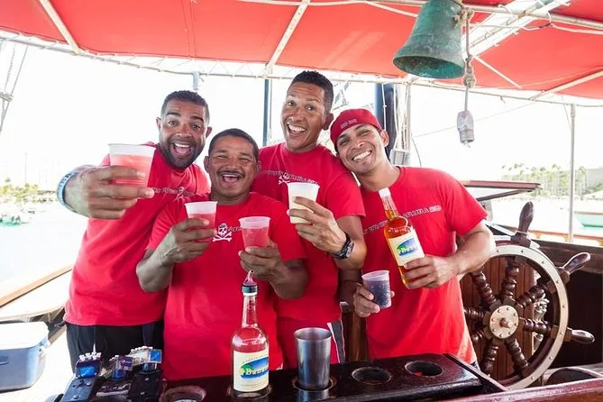Tu velada incluye embarque en MooMba Beach en un clásico bergantín pirata con barra libre de bebidas servidas por guías locales amigables. Tendrás acceso a dos baños a bordo y podrás probar tu valentía (o solo mirar) en el famoso columpio antes de regresar mientras cae la noche sobre la costa de Aruba.