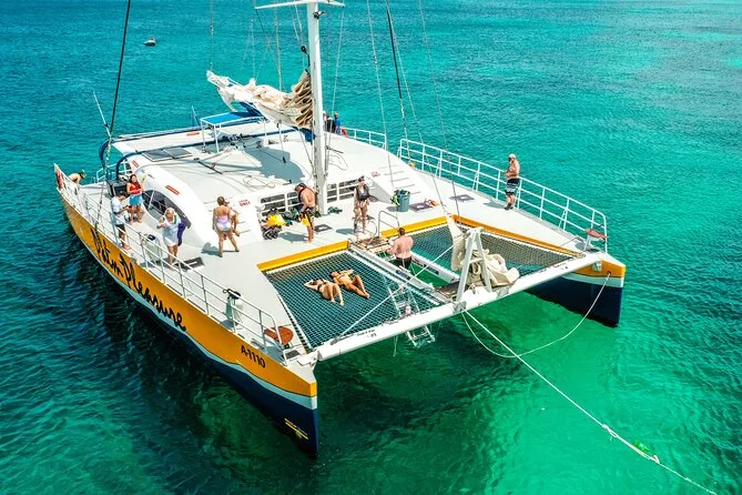 Navega la costa de Aruba en un espacioso catamarán con traslado incluido, haz snorkel en Boca Catalina y sobre el naufragio Antilla con guías amigables. Disfruta de barra libre y snacks tropicales mientras te secas bajo el sol salado. Risas, música y momentos bajo el agua que querrás revivir, además de tiempo para simplemente relajarte y dejar que Aruba haga su magia.