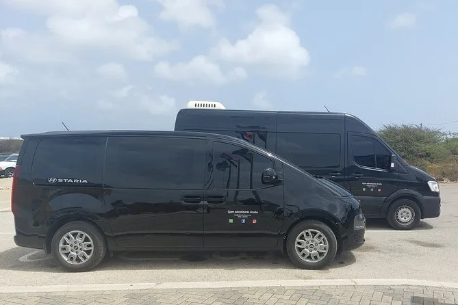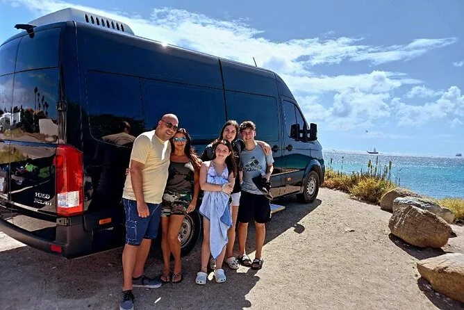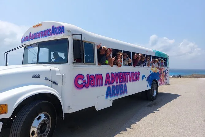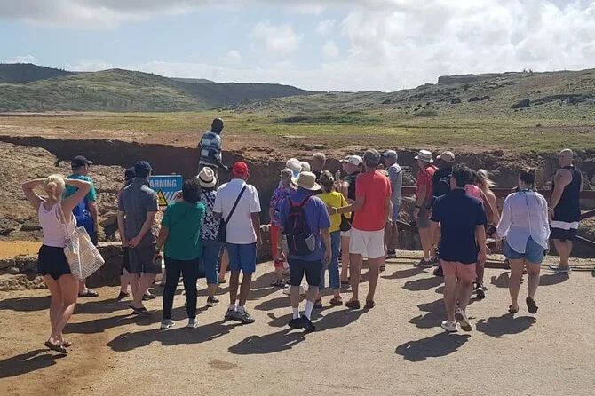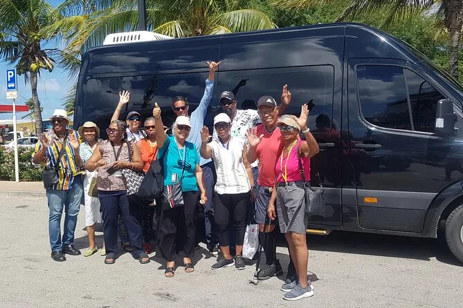 Tu día incluye recogida y regreso en hotel o terminal de cruceros en miniván o autobús con agua embotellada. Visitarás con guía sitios como Casibari Rock, Ayo Rocks, ruinas del Molino de Oro Bushiribana, ruinas del Puente Natural (y piscina en cueva cercana), además de dos horas para nadar en Baby Beach antes de regresar juntos.