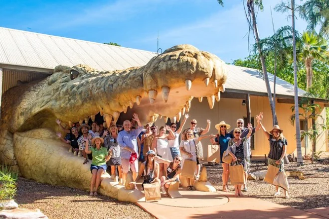 Te recogerán en Broome y entrarás directo al Parque de Cocodrilos Malcolm Douglas por esas enormes mandíbulas. Verás de cerca la alimentación de cocodrilos, escucharás historias reales de guías locales, recorrerás más de 2,500 cocodrilos y caimanes, y saldrás con un nuevo respeto por estas criaturas milenarias — y probablemente algo de polvo rojo en los zapatos.
