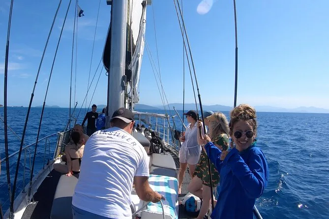 Casi pierdo el barco — literalmente. Justo al pisar el muelle en Cairns, la tapa de mi café salió volando, así que empecé este tour por la Gran Barrera de Coral y Green Island oliendo a café ambulante. A la tripulación no pareció importarle; uno de ellos sonrió y me ofreció una taza de té mientras zarpábamos. Hay algo especial en estar en un velero con solo unas 20 personas más que te hace relajarte. Se escuchan risas rebotando en el agua, no solo el ruido del motor.