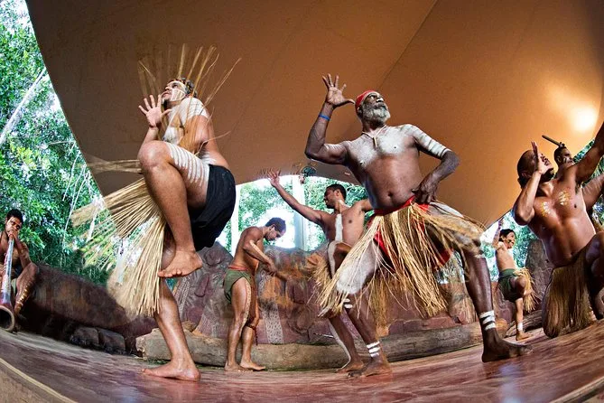 Después fuimos a Rainforestation — primero el almuerzo (buffet BBQ, nada lujoso pero abundante), luego subimos a un viejo vehículo Army Duck. Nuestro conductor se hacía llamar “Capitán Quokka”, lo que me hizo reír más de lo que debería. Señaló árboles más viejos que muchos países y nos dejó probar una hoja de pimienta silvestre (¡picante!). La experiencia aborigen Pamagirri fue justo después — lanzar el boomerang es más difícil de lo que parece, casi me pego en la espinilla. Los bailarines tenían una forma de hacerte sentir bienvenido sin decir mucho.