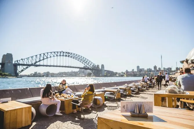 Podíamos elegir entre Opera Bar, House Canteen o Midden by Mark Olive — yo me decidí por Opera Bar porque, sinceramente, solo quería sentarme afuera y mirar los barcos un rato. El menú del paquete tour + comida es fijo, pero se sentía como un capricho; pedí pescado con piel crujiente y una copa de vino blanco frío que sabía mejor que nada después de tantas escaleras dentro (que son bastantes). Ver a la gente aquí es parte del encanto: turistas posando con helados, locales en traje discutiendo suavemente frente a sus laptops, gaviotas planeando su próximo robo. Me quedé más tiempo del que pensaba. Hay algo en comer justo bajo esas velas con toda Sydney girando a tu alrededor — difícil de explicar si no estás ahí.