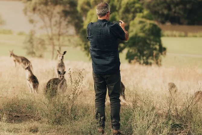 La última parte: safari de canguros. Avanzamos por un camino de tierra mientras Sam señalaba wallabies (“¡no son lo mismo que los canguros!”) y, claro, ahí estaban — canguros salvajes descansando bajo los eucaliptos como si fueran dueños del lugar. Fue una sensación extraña de paz estar ahí en la luz de la tarde, viendo cómo movían las orejas. Alguien susurró y todos guardamos silencio por un momento; aún recuerdo ese silencio antes de que las risas volvieran.