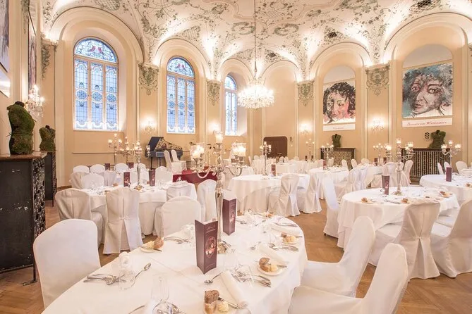 Tu noche incluye la entrada al Cena-Concierto Mozart en St. Peter Stiftskulinarium, en el casco antiguo de Salzburgo, con actuaciones en vivo de ópera por músicos vestidos con trajes de época, además de un menú de tres platos basado en recetas de la época de Mozart—recuerda que las bebidas son extra y las mesas compartidas se asignan al llegar.