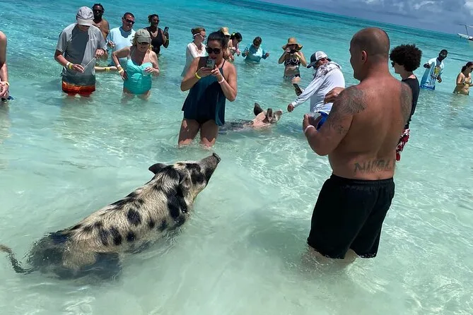 Después del snorkel, llegamos a la playa de Rose Island — arena tan fina que cruje bajo los pies. Hay un bar de playa si quieres almorzar (yo pedí pescado a la parrilla, sin arrepentimientos), o puedes llevar tu propia comida si eres más selectivo. Algunos añadieron los cerditos nadadores al tour — los vimos desde lejos chapoteando con niños que no paraban de reír. Si quieres esa parte, solo avisa antes; tiene costo extra pero se ve divertido. De regreso, Dwayne nos sirvió otra ronda de “Sweet Emily” y contó historias de su infancia aquí. Tenía esa habilidad de hacer que todos se sintieran como viejos amigos.