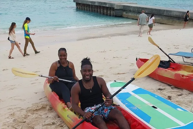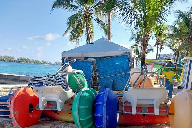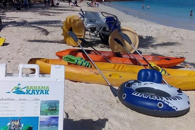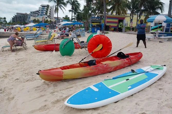 Tu día incluye acceso completo a todo el equipo de deportes acuáticos sin motor en Junkanoo Beach, Nassau: kayaks individuales y dobles, paddleboards, equipo de snorkel, flotadores inflables, además de balones de voleibol y fútbol playa, desde las 10 a.m. hasta las 5 p.m. No necesitas traer nada más que tu espíritu aventurero (y quizá protector solar).
