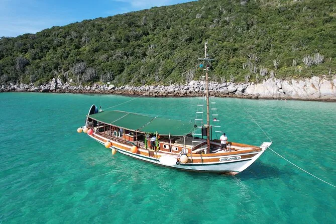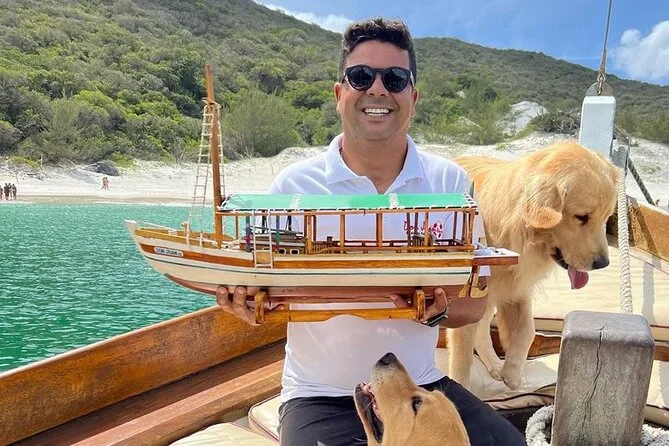 Vas a navegar en un amplio saveiro por las aguas turquesas de Arraial do Cabo con música suave y la compañía de dos golden retrievers amigables. Nada en playas protegidas por la marina, descubre formaciones rocosas únicas y comparte risas con locales y viajeros. Un plan relajado pero lleno de pequeños detalles que te harán recordar a esos perros mucho después de volver a casa.