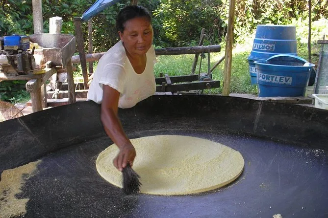 Almorzamos en una casa flotante: pescado a la parrilla (creo que tambaquí), arroz, frijoles y harina de yuca. Comida sencilla pero después de tanto sol supo a gloria. La familia que atiende sonrió con mi portugués torpe; su niño nos enseñó cómo comer yuca sin hacer desastre (yo fallé). Más tarde intentamos pescar pirañas en uno de esos canales estrechos — mucho chapoteo, pero yo solo saqué un pececillo que parecía más molesto que peligroso.