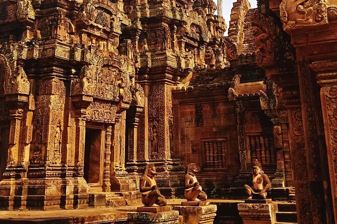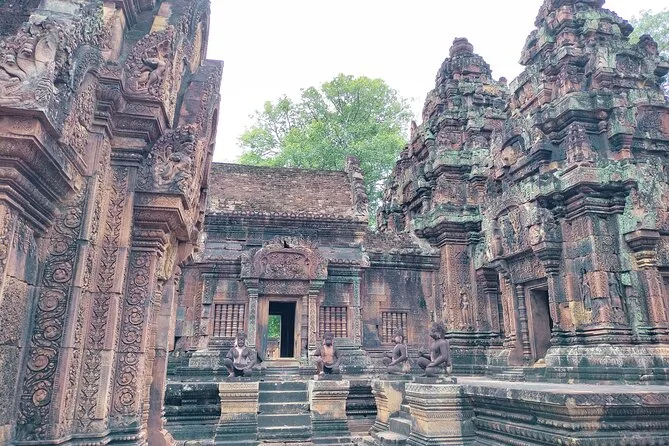 Tu día incluye recogida temprano en hotel de Siem Reap en SUV o minivan privado con aire acondicionado, agua fría y toallitas refrescantes. Te ayudarán a comprar el pase para los templos (no incluido), visitas guiadas a los principales templos con historias de tu guía local, tiempo para picnic (trae tu propio desayuno), almuerzo en restaurante local cerca de Banteay Srei, además de peajes y estacionamientos cubiertos, antes de regresar al hotel a media tarde.